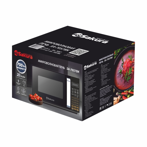 Номинальная выходная мощность микроволн 700Вт, внутренний объем 20 л, диаметр поворотного стола 245 мм, количество уровней мощности 6, параметры сети 230Вт ~50Гц, потребляемая мощность 1200Вт, режим разморозки по времени и весу, подогрев, 7 автоматических режимов приготовления, встроенные часы, сигнал об окончании готовки,таймер (99 минут и 99 сек макс.),управление электронное, LED-дисплей, блокировка от детей, цвет корпуса и передней панели черный, ручка хром. Особенности: дверца навесная, открывание дверцы-ручка, подсветка. Внешние габариты (В*Ш*Г), мм: 262×452×360 , внутренние размеры камеры (В*Ш*Г), мм: 178×315×296.