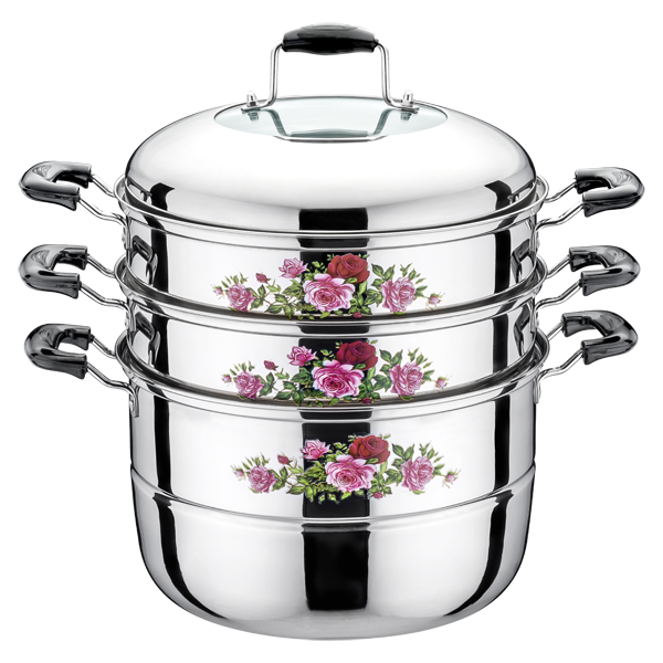 Мантоварка из нержавеющей стали с двумя съемными перфорированными чашами, объем 11 л, диаметр 28 см, капсулированное индукционное дно, с крышкой из термостойкого стекла и бакелитовыми ручками.