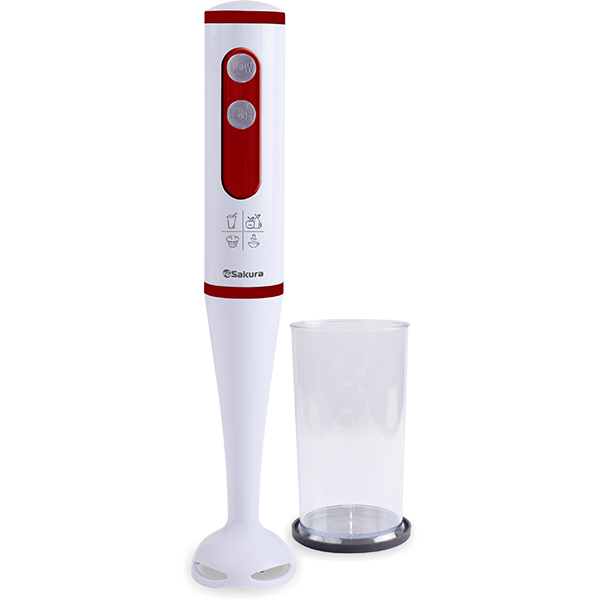 Блендерный набор, 600 Вт, мощный и тихий DC мотор, 2 скорости работы (низкая и высокая), лезвия из нержавеющей стали, погружная часть блендера из пластика, пластиковый корпус, градуированный стакан (0,6 л) с силиконовой крышкой-подставкой. Цвет: белый/красный.
