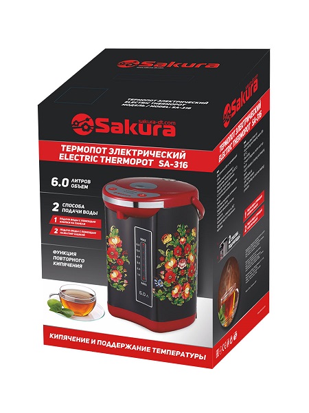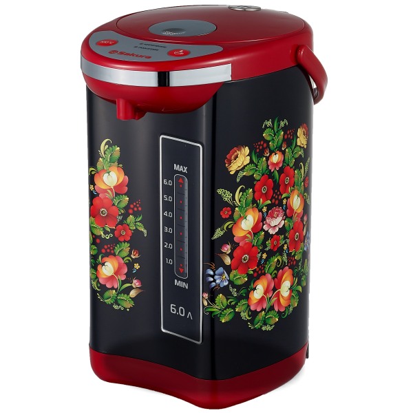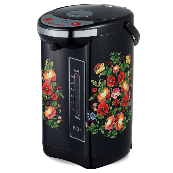 6,0 л, 750 Вт, повторное кипячение, поддержание температуры, 2 способа подачи воды (кнопкой на панели и нажатием чашкой), колба нерж.сталь