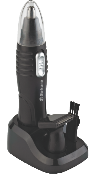 Триммер универсальный, 2 насадки (круглая - для носа и ушей; плоская горизонтальная - для висков, бороды, усов, бровей), острые стальные лезвия, питание от 1хАА (в комплект не входит), в комплекте - защитный колпачок и подставка для хранения.