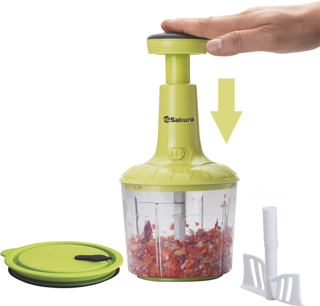 4) Нажимая на ручку, измельчите продукты.
