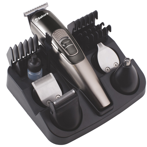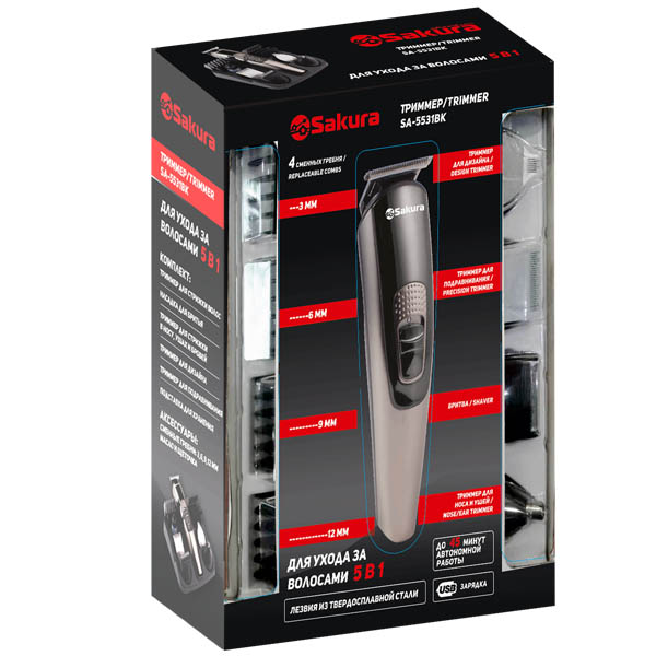 Триммер универсальный 5 в 1: для бороды, усов, бровей, ушей, носа, висков и т.д., 9 насадок в комплекте (4 гребней 3-12 мм, круглая насадка-триммер, 3 плоские насадки, насадка-бритва), автономная работа от аккумулятора до 45 минут без подзарядки, лезвия из стали, подставка для хранения