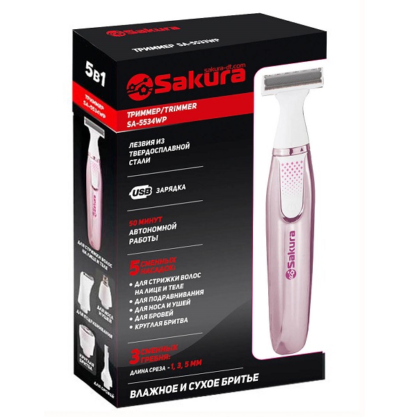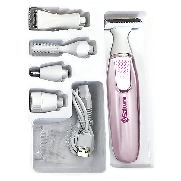 Триммер универсальный 5в1 для женщин: Т-образное лезвие, триммер для бровей, круглая бритва для лица, триммер для носа/ушей и насадка для подравнивания, аккумулятор литиевый 500 мАч, 3 насадки-гребня: 1,3,5 мм, USB кабель, 1,5 часа зарядки и 1 час использования, моющийся, цвет: белый/розовый хром.
