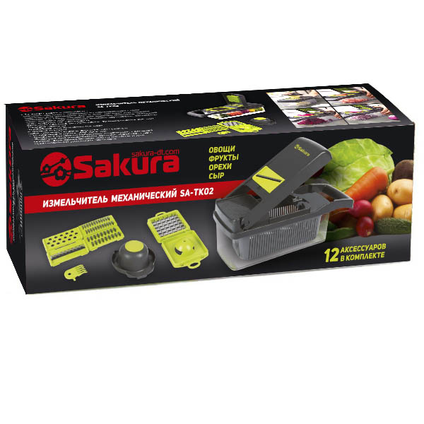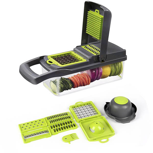 Измельчитель механический для нарезки кубиками, ломтиками и соломкой. В комплект входит 12 аксессуаров: - насадка для нарезки ломтиками, - 2 насадки для шинковки (3 и 4 мм), - насадка для фигурной нарезки, - насадка-чеснокодавка, - 2 насадки со стальными ножами для нарезки кубиками (4*4мм и 7*7мм), - сепаратор яиц, - контейнер для хранения насадок, - сливная корзина, - защитная насадка, - зубчатый скребок для очистки. Цвет: серый/зеленый.