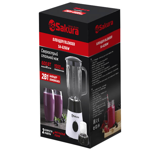 Блендер настольный, 600 Вт, 2-в-1 - блендер + мельница (кофемолка), 600 Вт, стеклянная чаша 1,5 л с градуировкой, 2 скорости + импульсный режим, мельница (кофемолка) из стекла, клапан на крышке для добавления продуктов, ножи из нержавеющей стали.
