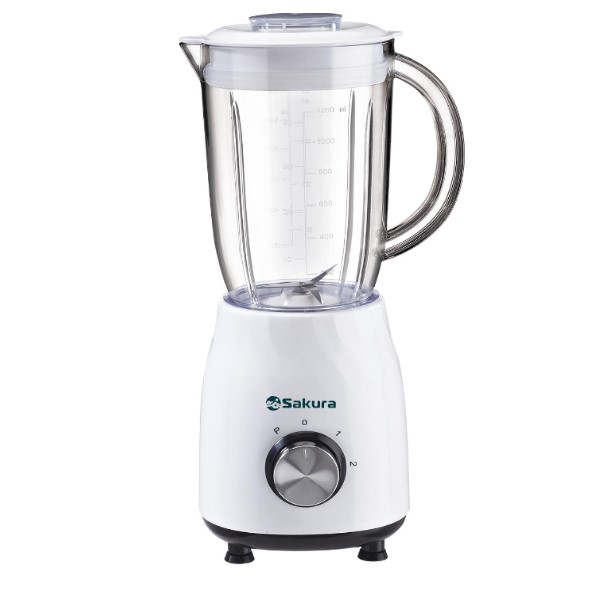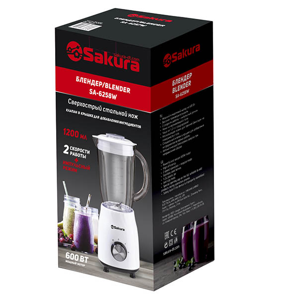 Блендер настольный, 600 Вт, 1,2 л, 2 скорости + импульсный режим, нескользящие ножки, клапан в крышке для добавления ингредиентов, блокировка при неправильной сборке.