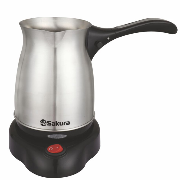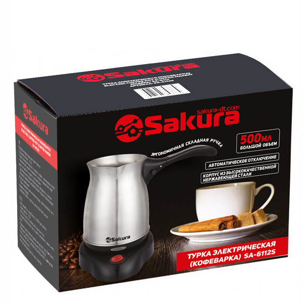 Турка электрическая. Объем 0.5 л, мощность 500 Вт, закрытый нагревательный элемент, складная ненагревающаяся ручка, защита от включения без воды, защита от перегрева; корпус: нержавеющая сталь. Цвет: серебристый/черный.