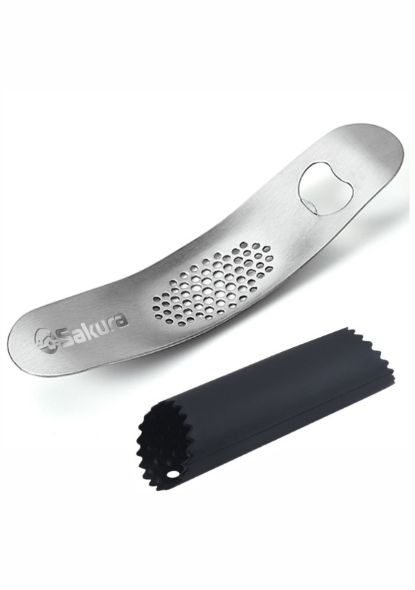 3 в 1: пресс для чеснока + открывалка для бутылок, силиконовый ролик для чистки чеснока. Материал пресса: высококачественная нержавеющая сталь. Размер: 19х4х2 см, вес: 78 г. Материал ролика: пищевой силикон, размер: 13х3,5 см, вес: 25 г. Можно мыть в посудомоечной машине.