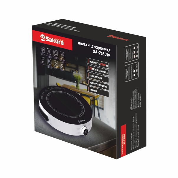 2200 Вт, индукционный нагревательный элемент, LED-дисплей, сенсорное и механическое управление, варочная поверхность из стеклокерамики, индикатор работы, регулировка мощности с шагом 100 Вт, функция таймера, блокировка панели управления, отсрочка старта. Диаметр конфорки 180 мм. Цвет корпуса: белый.