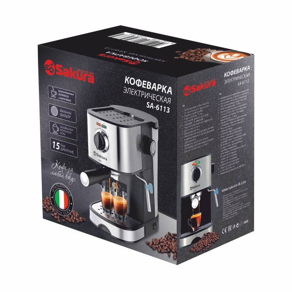 Кофеварка рожкового типа, приготовление эспрессо и капучино, 1,0 л резервуар, рабочее давление 15 бар, насадка для капучино, съемный поддон, рожок с фильтром на 2 чашки, мерная ложка с уплотнителем в комплекте. Мощность 850 Вт.
