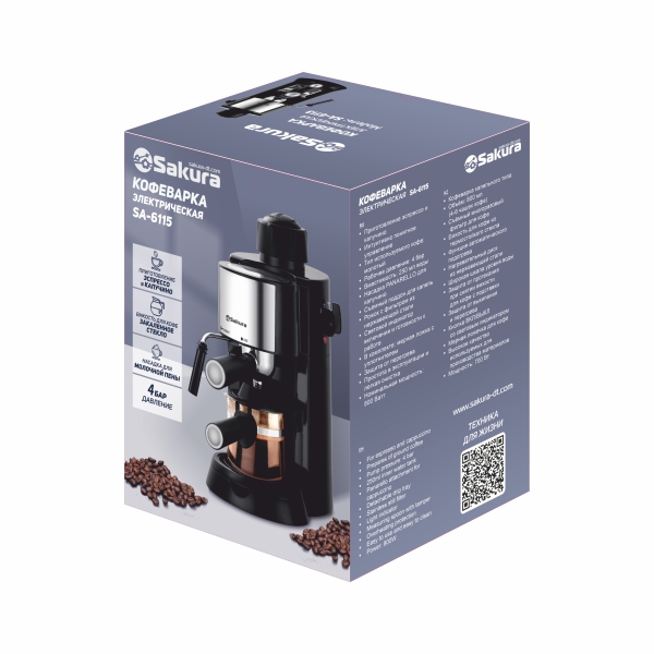 Кофеварка рожкового типа, приготовление эспрессо и капучино, вместимость 0,25 л, емкость для кофе из закаленного стекла, 4 бар, насадка для капучино, съемный поддон, рожок с фильтром из нерж.стали, мерная ложка с уплотнителем в комплекте. Мощность 800 Вт.