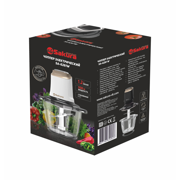 Мощность 500 Вт, 1,2л, стеклянная чаша, 2 двойных ножа из нержавеющей стали, силиконовая подставка, включение нажатием, цвет: SA-6261BK-черный/серебро, SA-6261W-золотой/белый