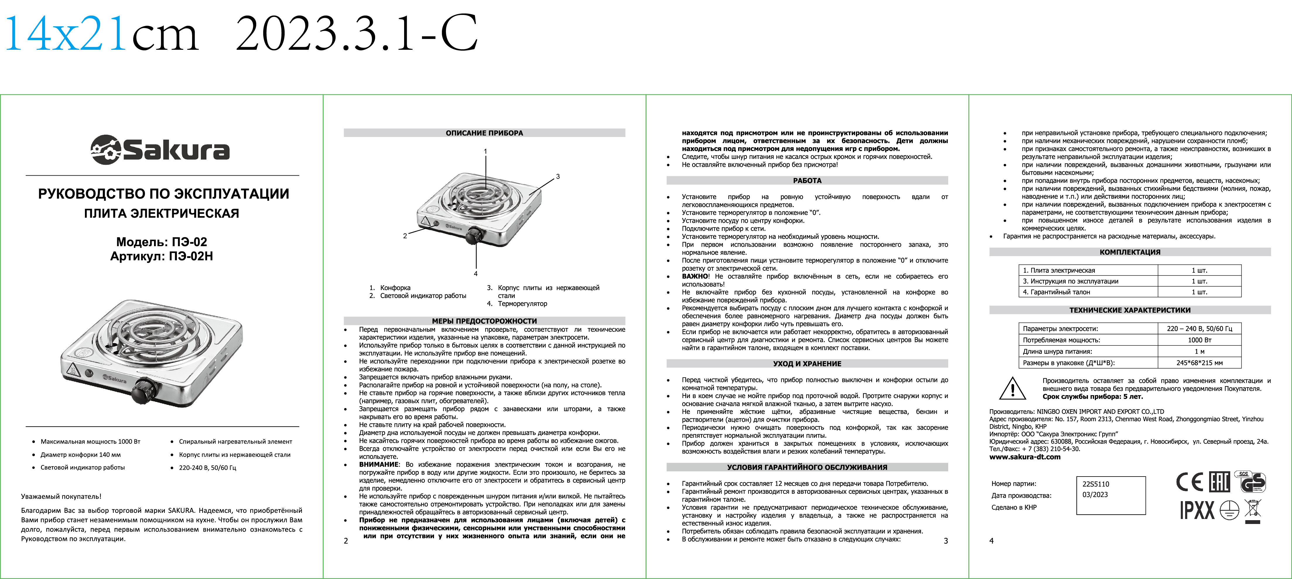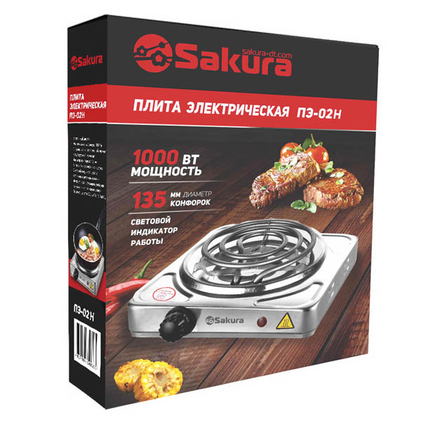 Мощность 1000Вт, 1 конфорка 145 мм, прочный корпус из нержавеющей стали, с которого легко удаляются загрязнения, спиральный нагревательный элемент, регулируемый термостат, индикатор работы. Длина сетевого шнура – 1м. Срок службы прибора – 5 лет. Цвет – нерж.сталь/черный