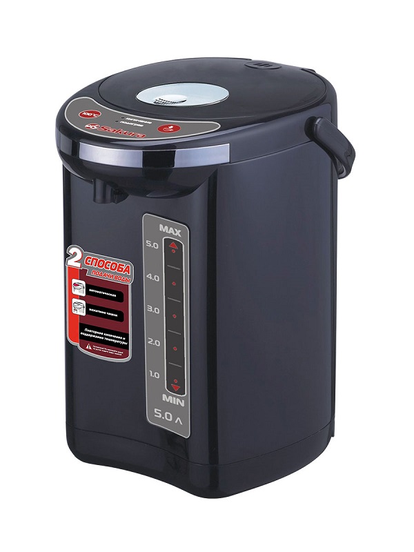 5,0 л, 750 Вт, повторное кипячение, поддержание температуры, 2 способа подачи воды (кнопкой на панели, нажатием чашки), колба нерж.сталь, корпус черный + черный пластик.