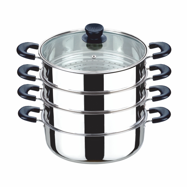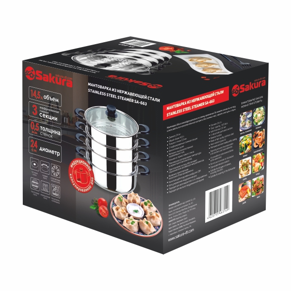 Мантоварка из нержавеющей стали с тремя съемными перфорированными чашами, объем 14,5 л, диаметр 24 см. Подходит для индукционных плит.
