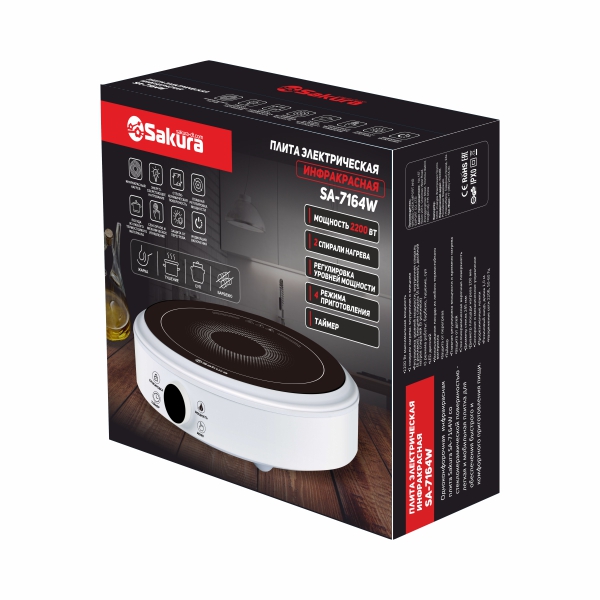 Плитка настольная круглая с инфракрасным нагревом, две спирали нагрева. Мощность: 2200 Вт. Конфорка: Стеклокерамика/1. Дисплей: есть. Диаметр конфорки 24,5 мм, диаметр нагрева 20 см, механическое/сенсорное управление, резиновый шнур 1,1 м.