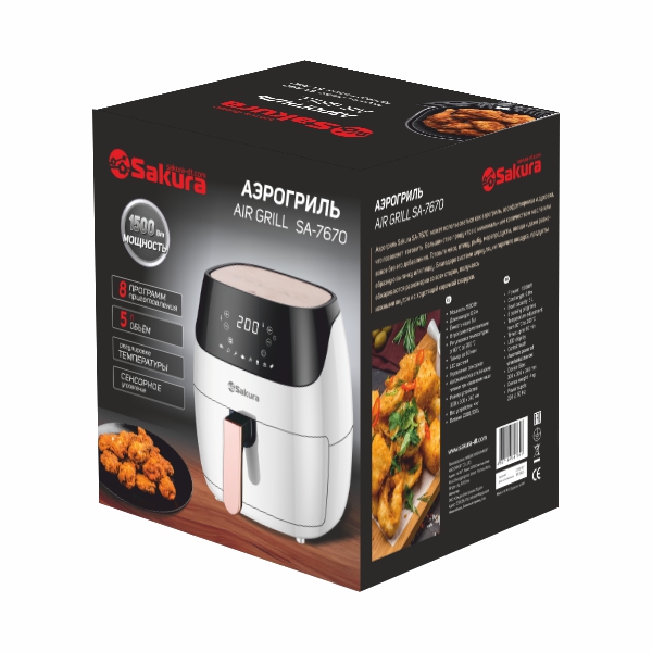 Аэрогриль, 1500 Вт, чаша с антипригарным покрытием 5,0 л, таймер на 60 минут, регулировка температуры 80-200С, сенсорное управление, LED дисплей, готовит без масла или с минимальным его использованием. Автоматическое отключение питания при извлечении корзины. 8 предустановленных программ меню. Подходит для всех блюд, которые готовятся в духовке.