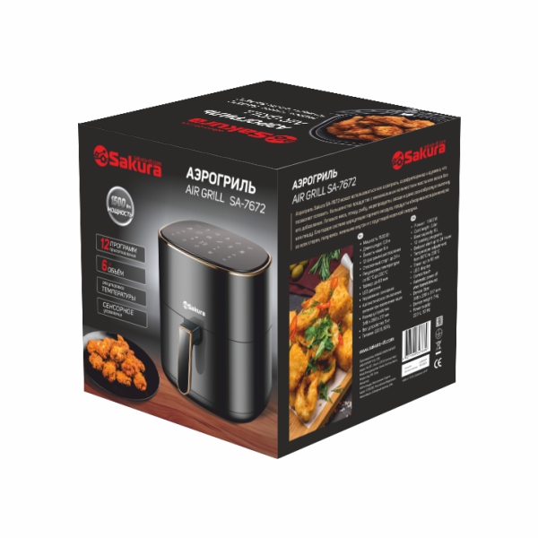 Аэрогриль, 1500 Вт, чаша с антипригарным покрытием 6,0 л, таймер на 60 минут, регулировка температуры 80-200С, сенсорное управление, LED дисплей, готовит без масла или с минимальным его использованием. Автоматическое отключение питания при извлечении корзины. 12 предустановленных программ меню. Подходит для всех блюд, которые готовятся в духовке. Размер: 34,8*28*31,7 см. Цвет - черный.