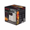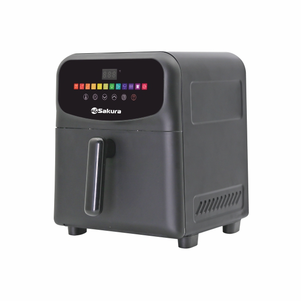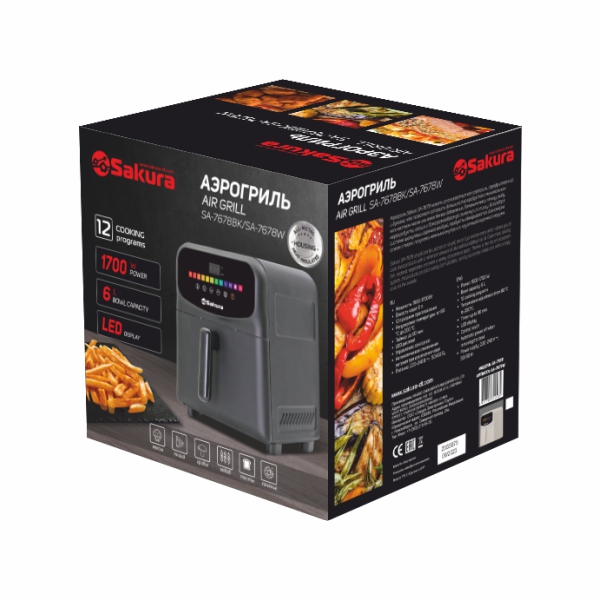 Аэрогриль металлический корпус, 1500-1700 Вт, чаша с антипригарным покрытием 6,0 л, 12 предустановленных программ, таймер на 90 минут, регулировка температуры 60-200С, сенсорное управление, LED дисплей, готовит без масла или с минимальным его использованием. Автоматическое отключение питания при извлечении корзины. Подходит для всех блюд, которые готовятся в духовке. Цвет черный. Длина шнура 90см.