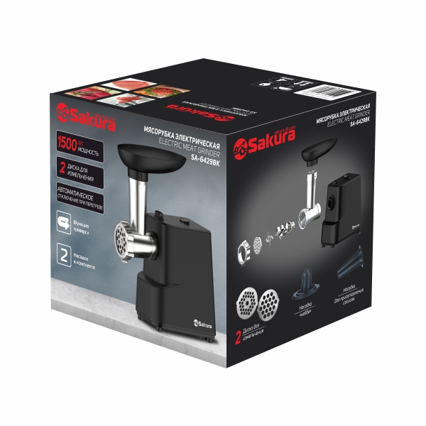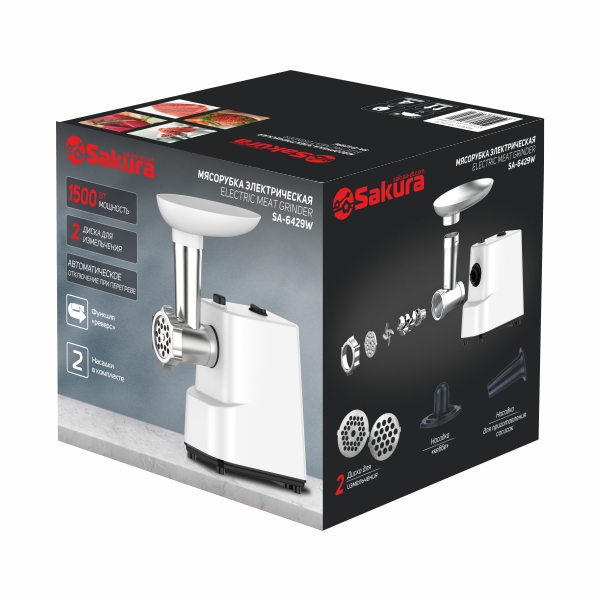 Мясорубка электрическая, мощность 1500 Вт, функция "реверс", корпус из эко-пластика, пластиковый лоток, металлический шнек, толкатель, нож из нержавеющей стали, металл диски для измельчения (5 мм и 7 мм), отключение при перегреве. Аксессуары: насадки для кеббе и для сосисок. Производительность: 0.9кг/мин. Длина шнура 0,8 м.