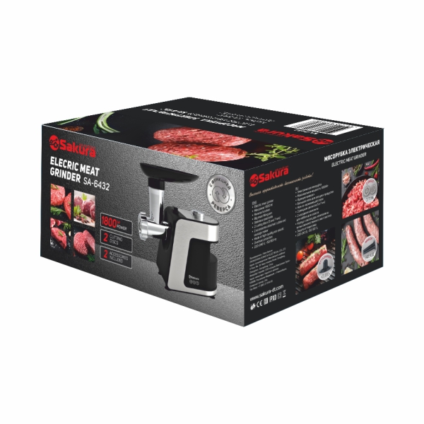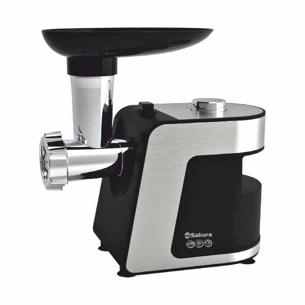 Мясорубка электрическая 1800 Вт, функция реверс, корпус плаcтик + нержавеющая сталь, мощный мотор с защитой от перегрева, набор решеток для фарша: маленькая (5мм), средняя (7мм), прорезиненные нескользящие ножки. Аксессуары: насадки для приготовления сосисок и колбасок кеббе. Цвет: черный/нержавеющая сталь. Длина шнура: 1м.