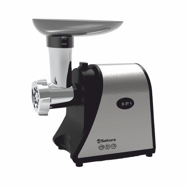 Мясорубка электрическая 1800 Вт, функция реверс, корпус из плаcтика + нержавеющая сталь, мощный мотор с защитой от перегрева, набор решеток для фарша: маленькая (5мм), средняя (7мм), прорезиненные нескользящие ножки. Аксессуары: насадки для приготовления сосисок и колбасок кеббе. Цвет: черный/нержавеющая сталь. Длина шнура: 1м.