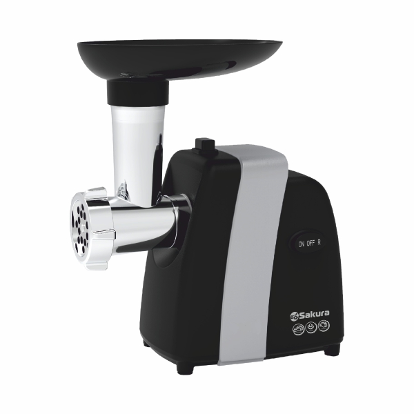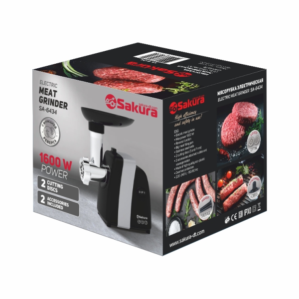 Мясорубка электрическая 1600 Вт, функция реверс, корпус из платика, мотор с защитой от перегрева, набор решеток для фарша: маленькая (5мм), средняя (7мм), прорезиненные нескользящие ножки. Аксессуары: насадки для приготовления сосисок и колбасок кеббе. Цвет: черный/серебряный. Длина шнура: 1м.