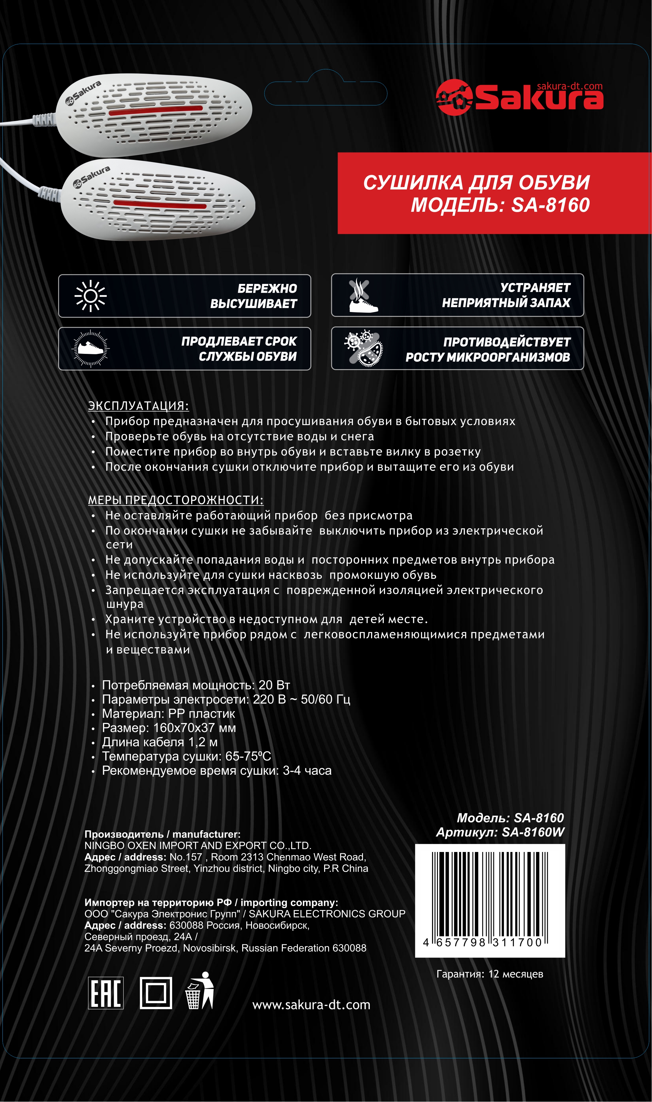 Сушилка для обуви электр., 160х70х37 мм, 20 Вт, температура сушки 65-75°C, длительность 3-4 часа, кабель 1,2 м, РР пластик.