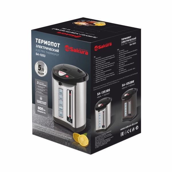 Термопот, объём 5,0 л, 750-900 Вт, повторное кипячение, поддержание температуры, 3 способа подачи воды (помпой, кнопкой на панели, нажатием чашкой), колба нержавеющая сталь.
