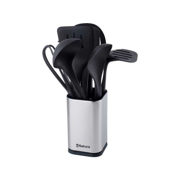 стакан для хранения, половник, лопатка, лопатка с прорезями, ложка, ложка с прорезями, щипцы, венчик |