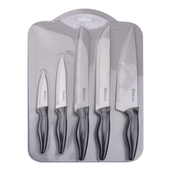 Набор ножей 6 предметов: шеф-нож, хлебный нож, нож слайсер, нож универсальный, нож для фруктов, пластиковая разделочная доска; материал: нержавеющая сталь, пластик. Набор ножей состоит из инструментов со своими функциональными предназначениями. Ножи помогут вам справиться с приготовлением самых разнообразных блюд из мяса, птицы, рыбы или овощей и прочее. Удобные и практичные ножи сделают процесс приготовления более простым и удобным. В наборе также есть пластиковая раздельчная доска.