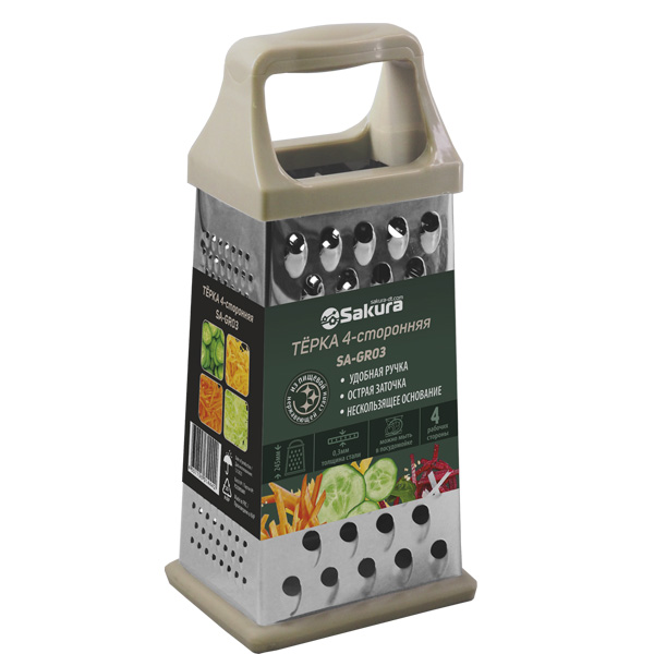 Универсальная 4-х сторонняя тёрка, поможет быстро шинковать, крупно или мелко натереть овощи, фрукты и другие продукты. Высота 24.5см, толщина металла 0,3мм.Нескользящее прорезиненное основание предотвращает скольжение во время использования и защищает поверхность от повреждений.Необходимо вымыть сразу после использования. Рекомендуется замачивать терку в теплой воде. Не рекомендуется использовать для чистки металлические щетки, губки или мочалки. Можно мыть в посудомоечной машине.