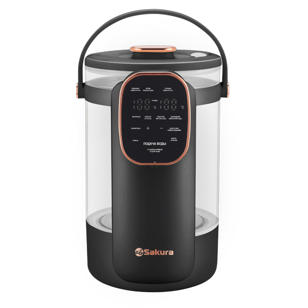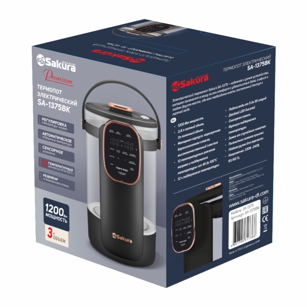 Термопот, 3л полезный объем, 3,8л общий объем, 1200Вт, 12 режимов нагрева: 45-100°С, LCD сенсорный дисплей, колба из стекла, кипячение, функция "чистая вода", «очистка от хлора», «охлаждение кипяченой воды», поддержание температуры, блокировка кнопок, защита от перегрева и включения без воды, 6 режимов объема подачи воды. Длина шнура 0.85м.