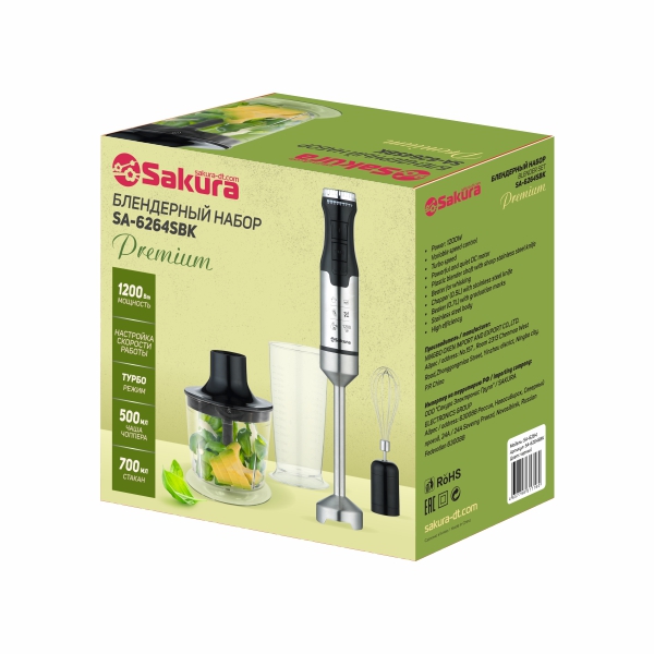 Блендерный набор Premium, 1200 Вт, мощный и тихий DC мотор, 20 скоростей работы + турбо-режим, лезвия из нержавеющей стали, погружная часть блендера из нержавеющей стали, насадка-венчик из стали, градуированный стакан (0,7 л), чоппер (0,5 л) с острыми ножами из нержавеющей стали, стальной корпус.