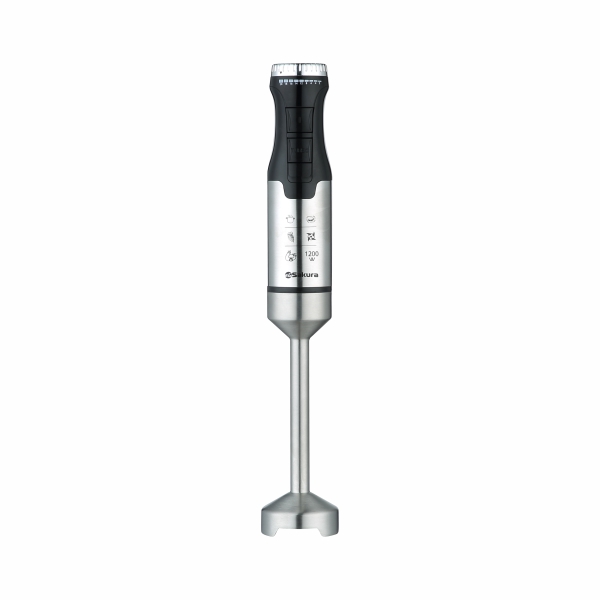 Блендер погружной, 1200Вт, тип - погружной, мощный DC мотор, 20 скоростей работы + турбо-режим, острые лезвия из нержавеющей стали, насадка из нержавеющей стали, корпус из нержавеющей стали.
