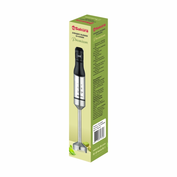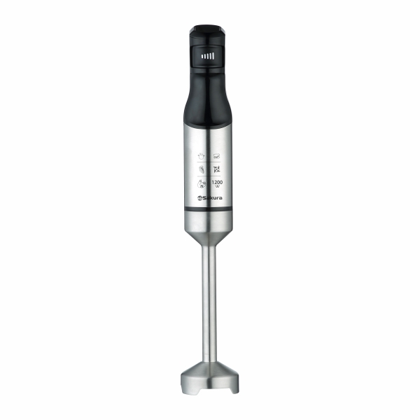 Блендер погружной Premium, 1200 Вт, тип - погружной, мощный DC мотор, 20 скоростей работы (регулировка силой нажатия), острые лезвия из нержавеющей стали, насадка из нерж.стали, корпус из нерж.стали