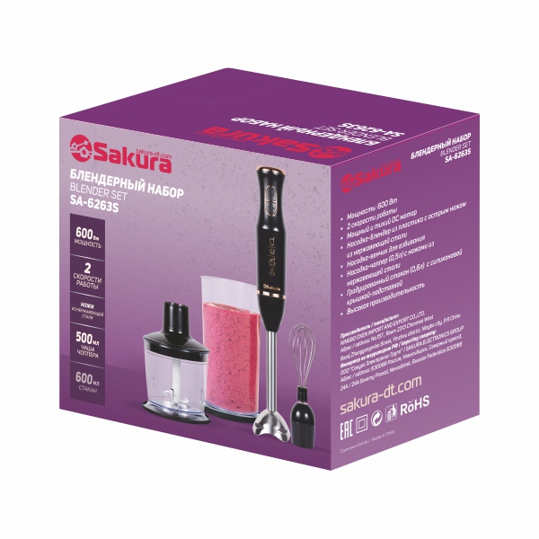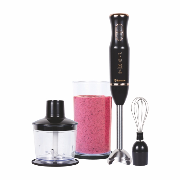 Блендерный набор, 600 Вт, мощный и тихий DC мотор, 2 скорости работы, лезвия из нержавеющей стали, погружная часть блендера из нержавеющей стали, насадка-венчик из стали, градуированный стакан (0,6 л) с силиконовой крышкой-подставкой, чоппер (0,5 л) с острыми ножами из нержавеющей стали