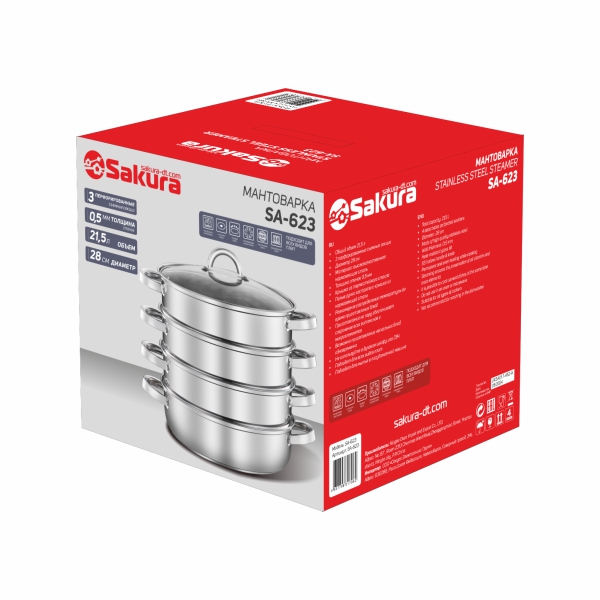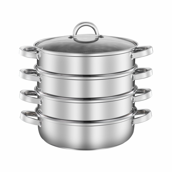 Мантоварка из нержавеющей стали со съемными перфорированными чашами, объем 21,5 л, диаметр 28 см, 3 яруса, корпус из нержавеющей стали, толщина стенок кастрюли 0,5 мм, толщина стенок секции 0,4 мм, капсулированное дно, крышка из термостойкого стекла. Подходит для индукционных плит.