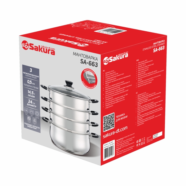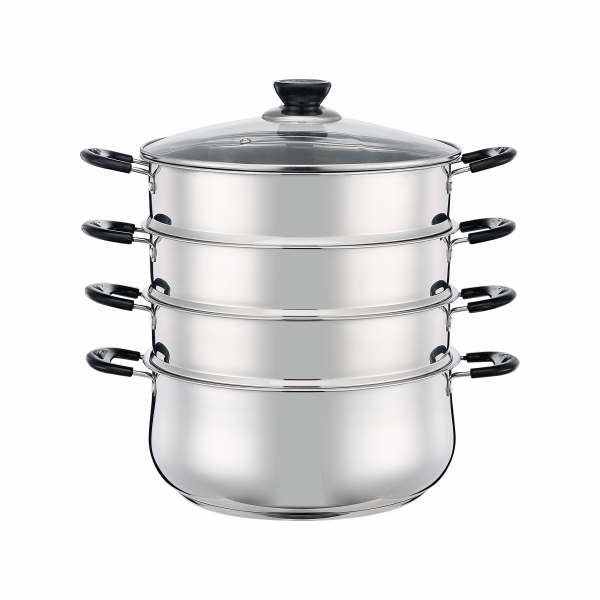 Мантоварка из нержавеющей стали с двумя съемными перфорированными чашами. Объем 14,5 л, диаметр 24 см, 3 яруса, корпус из нержавеющей стали, толщина стенок кастрюли 0,5 мм, толщина стенок секции 0,4 мм, капсулированное дно,крышка из термостойкого стекла. Подходит для индукционных плит.