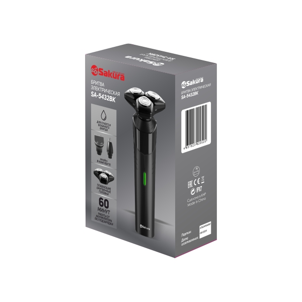 Бритва электрическая для сухого и влажного (IPX7) бритья, 5в1: 3 плавающие бритвенные головки, триммер для подравнивания и триммер для носа и ушей, питание от литиевого аккумулятора 600 мАч, 1,5 ч зарядка, до 60 минут работы без подзарядки. В комплекте 5 насадок: бритва, триммер для подравнивания, насадка для очищения лица, насадка для массажа лица, триммер для носа, USB кабель Type-C, защитная крышка, кисточка д/очистки.