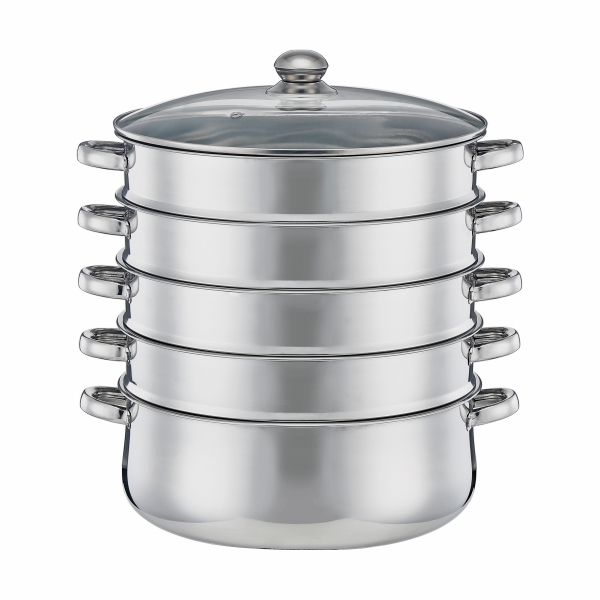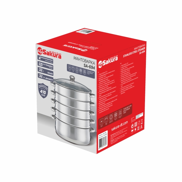 Мантоварка из нержавеющей стали. Объем 32 л, диаметр 32 см, 4 яруса, корпус из нержавеющей стали, толщина стенок кастрюли 0,5 мм, толщина стенок секции 0,4 мм, крышка из термостойкого стекла. Подходит для индукционных плит. Материал: нержавеющая сталь 410.