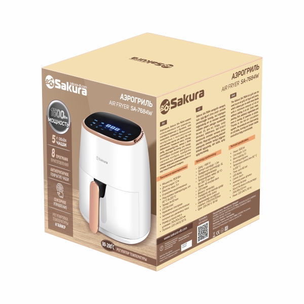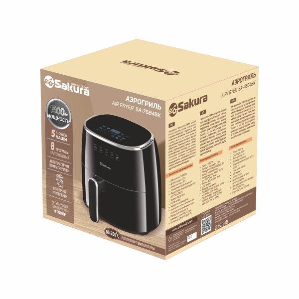 Аэрогриль, 1500 Вт, чаша с антипригарным покрытием 5,0 л, 8 программ приготовления, регулировка температуры от 80 °C до 200 °C, таймер на 60 мин, LED дисплей, сенсорное управление, автоматическое отключение питания при извлечении чаши. Размер устройства в упаковке: 310х310х332 мм. Длина шнура 120см.