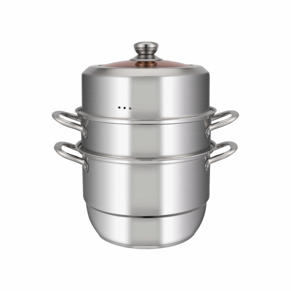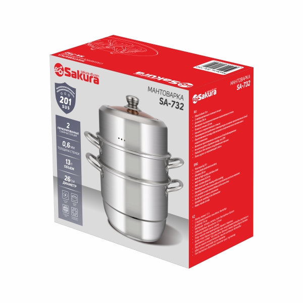 Мантоварка. Объем мантоварки 13 л, объем нижней кастрюли 9,8 л, диаметр 26 см, 3 яруса, корпус из нержавеющей стали, толщина стенок кастрюли 0,6 мм, крышка из тонированного термостойкого стекла. Материал: нержавеющая сталь 201.
