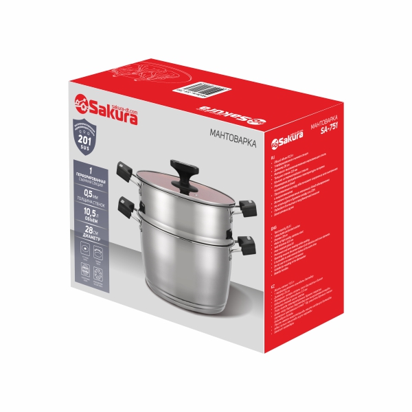 Мантоварка. Объем общий 10,5 л, объем нижней кастрюли 9,2 л, диаметр 28 см, 1 ярус, корпус из нержавеющей стали, толщина стенок кастрюли 0,5 мм, крышка из тонированного термостойкого стекла. Материал: нержавеющая сталь 201.