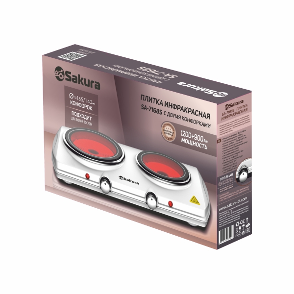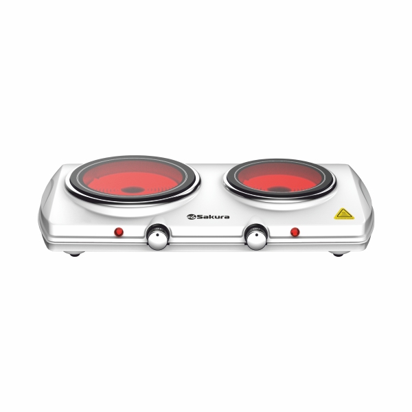 Плитка настольная с инфракрасным нагревом, 2 стеклокерамических конфорки, мощность 1200Вт / 900Вт, диаметр конфорок 16.5см / 14см, размер прибора - 475*275*83мм, максимальная температура нагрева 530-570С, максимальная нагрузка на плиту 16кг (по 8кг на конфорку), механическое управление, световой индикатор, шнур 0,8 м, цвет белый
