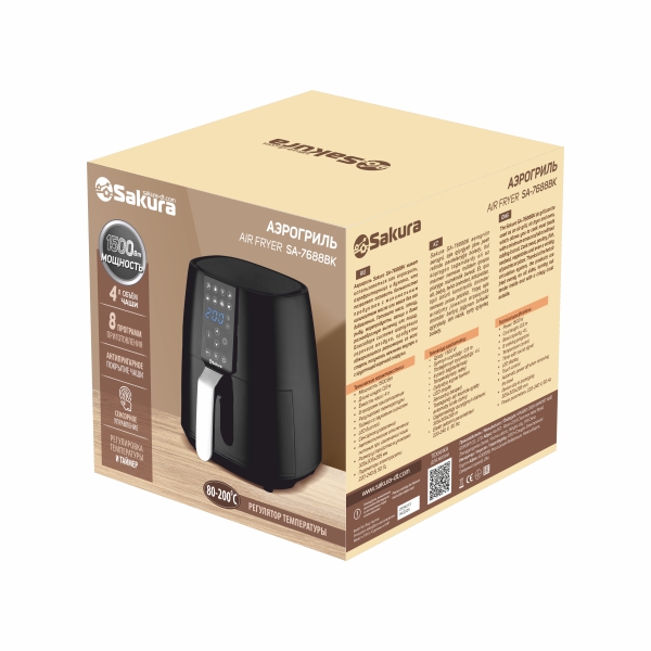 Аэрогриль, 1500 Вт, чаша с антипригарным покрытием 4,0 л, 8 программ приготовления, таймер со звуковым сигналом, регулировка температуры 80-200С, сенсорное управление, готовит без масла или с минимальным его использованием. Антипригарное покрытие чаши. Подходит для всех блюд, которые готовятся в духовке. Цвет черный. Длина шнура 80см. Размер устройства в упаковке: 305x305x295 мм.
