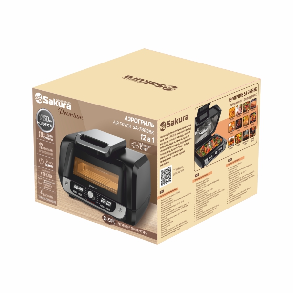 Многофункциональный аэрогриль 12 в 1: жарка, запекание, приготовление на пару, выпечка, гриль и многое другое с помощью одного устройства. Мощность 1750Вт, объем внутренней камеры 10л, 12 программ, верхний и нижний нагрев - готовка с закрытой или открытой крышкой, панель управления с двумя дисплеями, 6 аксессуаров в комплекте (чаша-сковорода 350*244*67мм, объем 3,3л, корзина для аэрофритюра: 312*187*75мм, объем 3,8л, металлическая решетка, стеклянная крышка с ручкой, силиконовые прихватки, щетка для очистки), защита от перегрева, смотровое окно, подсветка, регулировка температуры от 50 до 230°C, таймер до 24 часов.