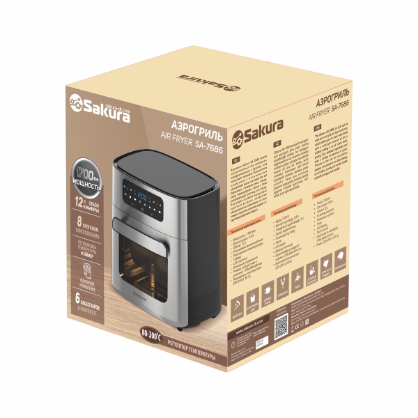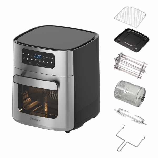Аэрогриль, 1700 Вт, объем 12 л, 8 программ приготовления, регулировка температуры и таймер, сенсорное управление, 6 аксессуаров в комплекте (поддон для сбора масла, решетка, сетчатая корзина, ручка для извлечения корзины, вертел, шашлычница на 10 шампуров), готовит без масла или с минимальным его использованием, подходит для всех блюд, которые готовятся в духовке. Цвет черный / сталь. Длина шнура 80см. Размер устройства в упаковке: 378x360x434 мм.