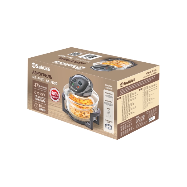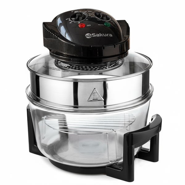 Аэрогриль, 1400 Вт, стеклянная чаша 12,0 л, расширительное кольцо для увеличения объема до 17л, таймер на 60 минут, регулятор температуры 65-250° С, механическое управление, готовит без масла или с минимальным его использованием. Подходит для всех блюд, которые готовятся в духовке. Цвет черный. В комплекте: высокая решетка, низкая решетка, ухват, расширительное кольцо. Длина шнура 1м.